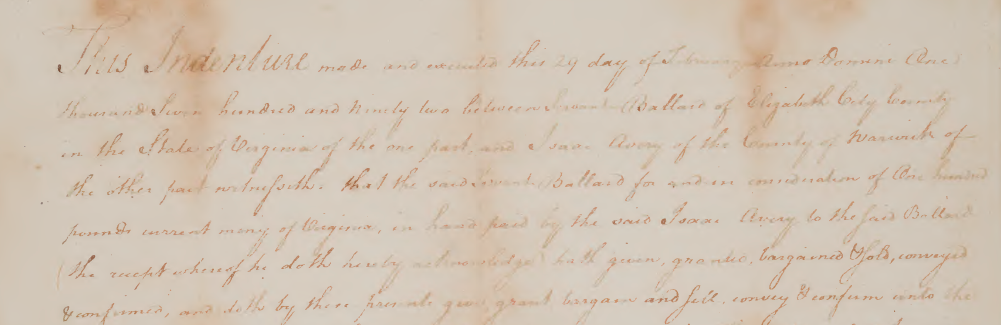 This indenture made and executed this 29 day of February anno domini one thousand seven hundred and ninety two between Servant Ballard of Elizabeth City County in the State of Virginia of the one part, and Isaac Avery of the County of Warwick of the other part …