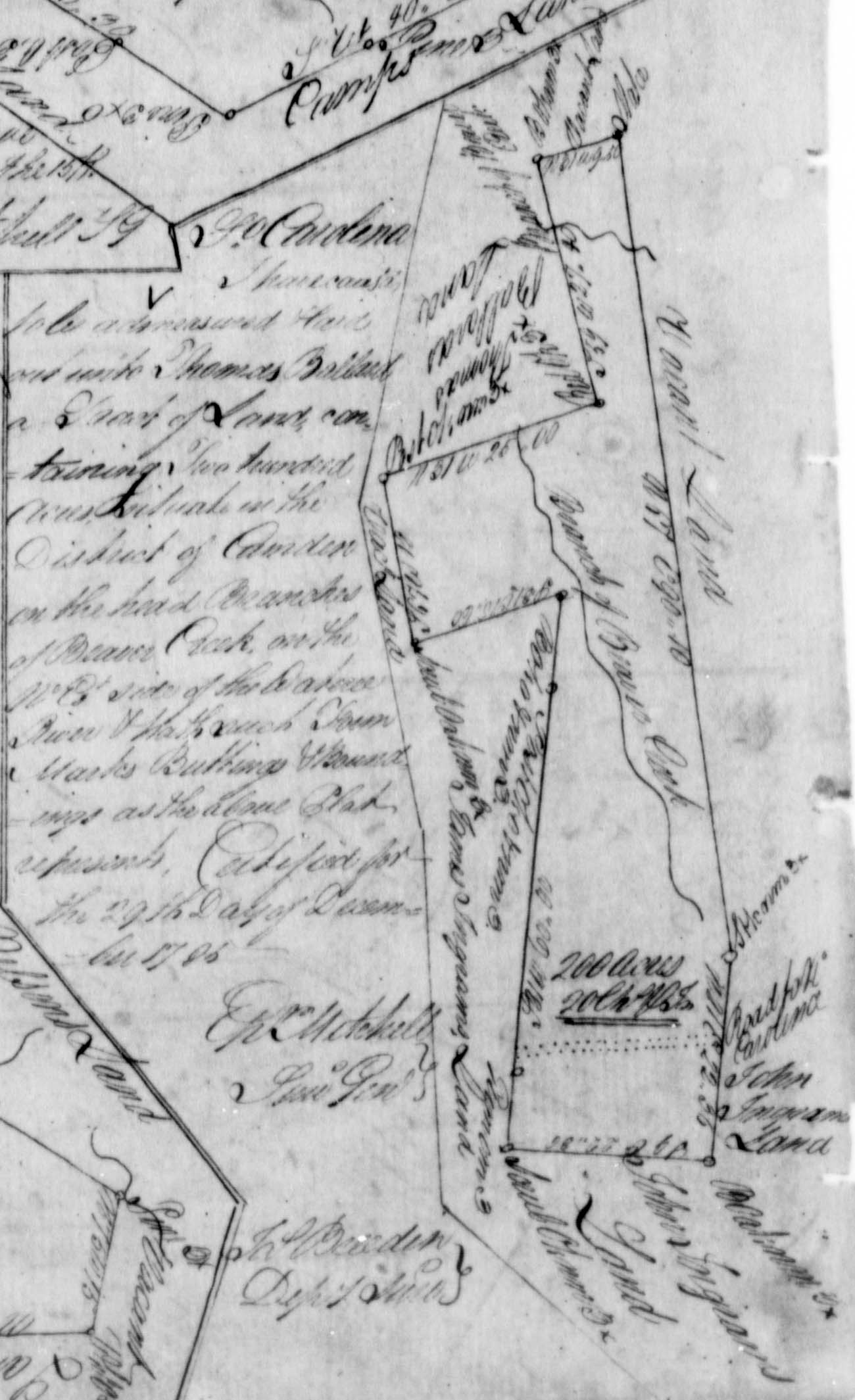 Indeed, the deed records show that Thomas did, in fact, convey one of the parcels he patented in 1785 to David Ballard, who is probably the David G. Ballard named in the Aikins lawsuit. That conveyance was for 200 acres on a branch of Beaver Creek in Kershaw County, for 38 pounds, to David Ballard by deed dated 10 March 1794, but not recorded until 12 October 1807 in Kershaw Co. SC Deed Book E, p. 401 (see original plat below). The witnesses to that deed included William Miller, John Ballard and William Ballard (William’s signature is indicated by “his mark”). William is possibly another son of Thomas — and if that is the case, here we may have the names of Thomas’ five sons who were counted in the 1810 census (James, John, Thomas, David and William). The 1810 census shows only one female age 45 and over, and one female age 10 to 15; Thomas’ daughter Susanna had married Samuel Caston by this time, leaving Mary as the sole daughter in the household. Much more study is needed to establish whether this hypothesis is true.