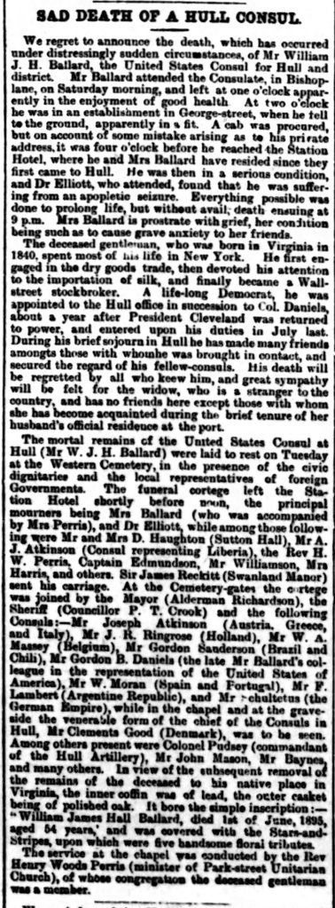 Georgianna Blair Ballard’s 1883 will named only her daughters; the omission of William suggested that he had pre-deceased her, but now we learn that is not the case. The numerous crossings to Liverpool suggested business dealings in England, and a search of English newspapers revealed notice of William’s untimely death in the city of Hull on 1 June 1895 where he served as United States Consul (“Sad Death of a Hull Consul”, Hull Express, Saturday, 8 June 1895, p. 6, col. 3). He had a distinguished career, and we’re thankful to know a little more of his story — and his end.