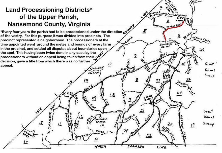 At a Vestry held in Suffolk Town Tuesday the 25th Octr 1763 for Appointing Processioners for the Different Districts in the upper Parish of Nansemond … Ordered that Benja. Forest & Elisha Ballad procession all the Bounds of Land No. 6 according to Law … Ordered that John Ballard & Willm Red procession all the Bounds of Land No. 23 according to Law …